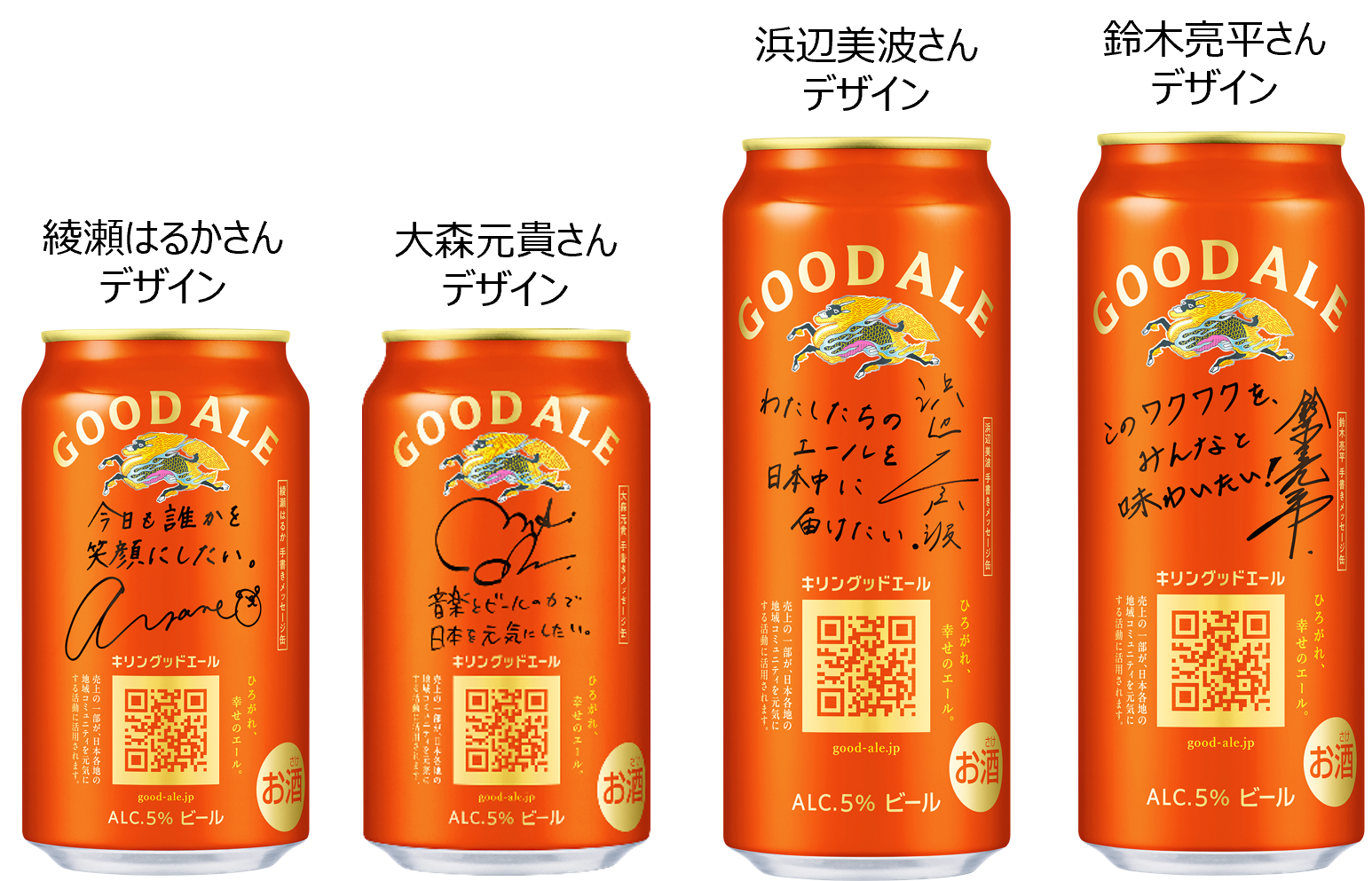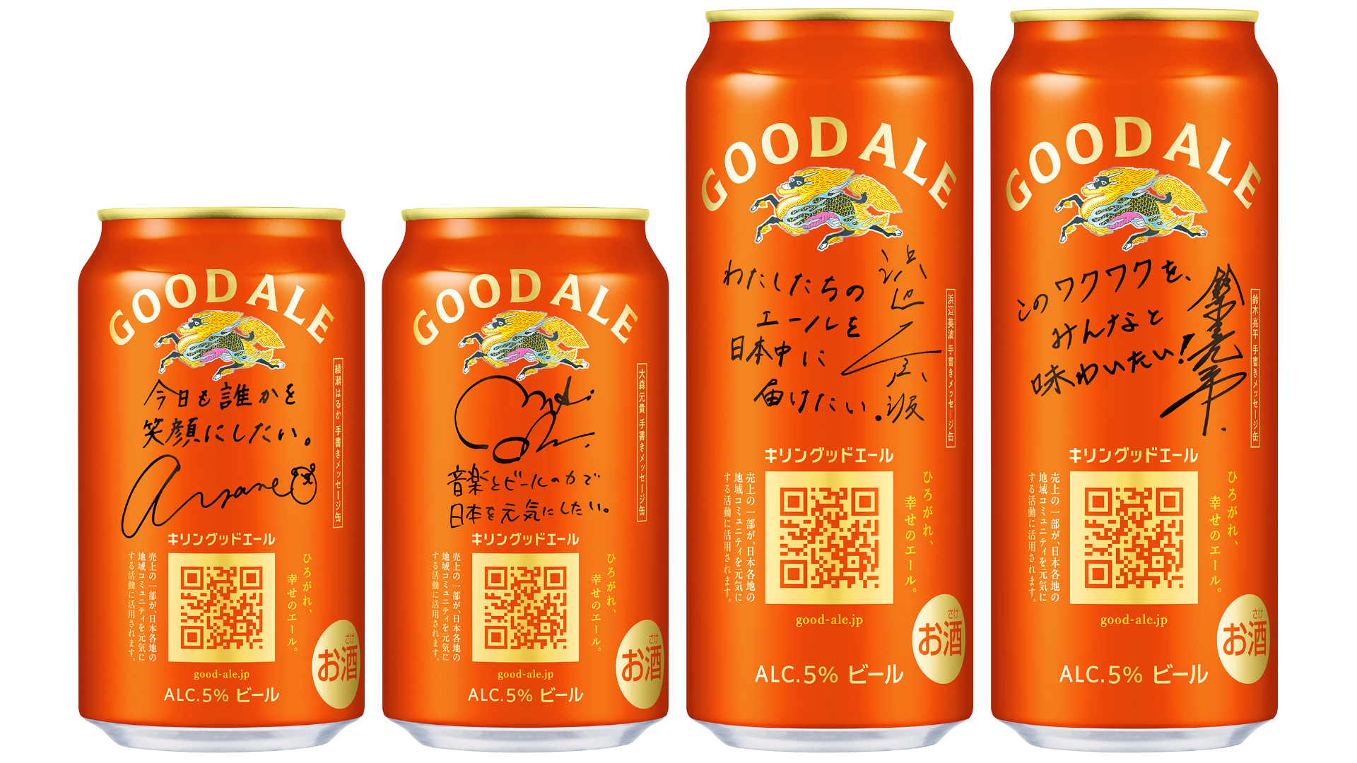 「キリングッドエール 限定メッセージ缶」はブランドリーダーを務める綾瀬はるかさん、Mrs. GREEN APPLE 大森元貴さん、浜辺美波さん、鈴木亮平さんの4名が、ブランドの志に共感し “日本を明るくしたい”という思いを乗せた手書きメッセージを、パッケージ裏面にデザインされています。また、日本の未来を明るくするアクションである「グッドエールJAPAN」も実施されていて、日本全校の自治体と協力して未来に向けて日本各地の地域コミュニティを元気にする活動にエールを送っています。いつものラガータイプは違う華やかでフルーティな味わいの「キリングッドエール 限定メッセージ缶」、4人のブランドリーダーのメッセージを読みながら明るく満たされるひと時を味わいましょう。